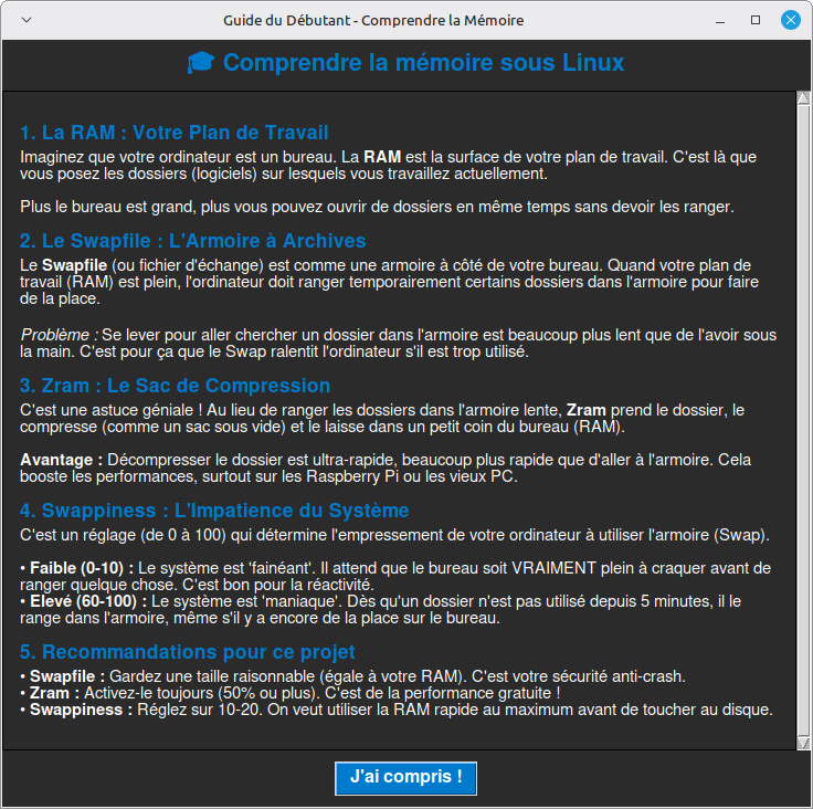 Ce projet vise à fournir un outil simple, robuste et pédagogique pour optimiser la gestion de la mémoire sur les systèmes Linux, en particulier pour les configurations type Raspberry Pi 5.