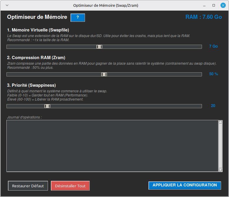 - Réglage : Utilisez les curseurs pour définir la taille du swap, le pourcentage de Zram et la Swappiness.